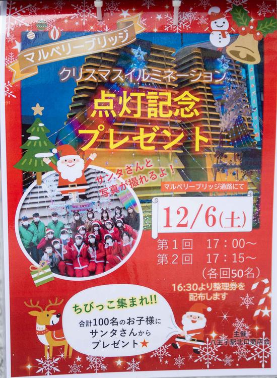 ランチの後は、夕方のイベントへ。八王子駅北口のマルベリーブリッジでは、16:30から点灯記念プレゼントの整理券を配布します。サンタさんとの写真撮影コーナーもあり、子どもたちが喜ぶこと間違いなし。ゆるっと回ってきた一日の締めにぴったりです。