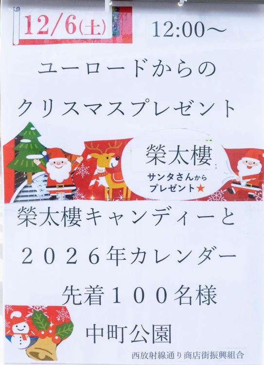 そのまま中町公園に残れば、12:00から「ユーロードからのクリスマスプレゼント」へ。榮太樓キャンディーと2026年カレンダーがもらえる先着100名企画です。猿まわしからの流れで参加しておきましょう!
