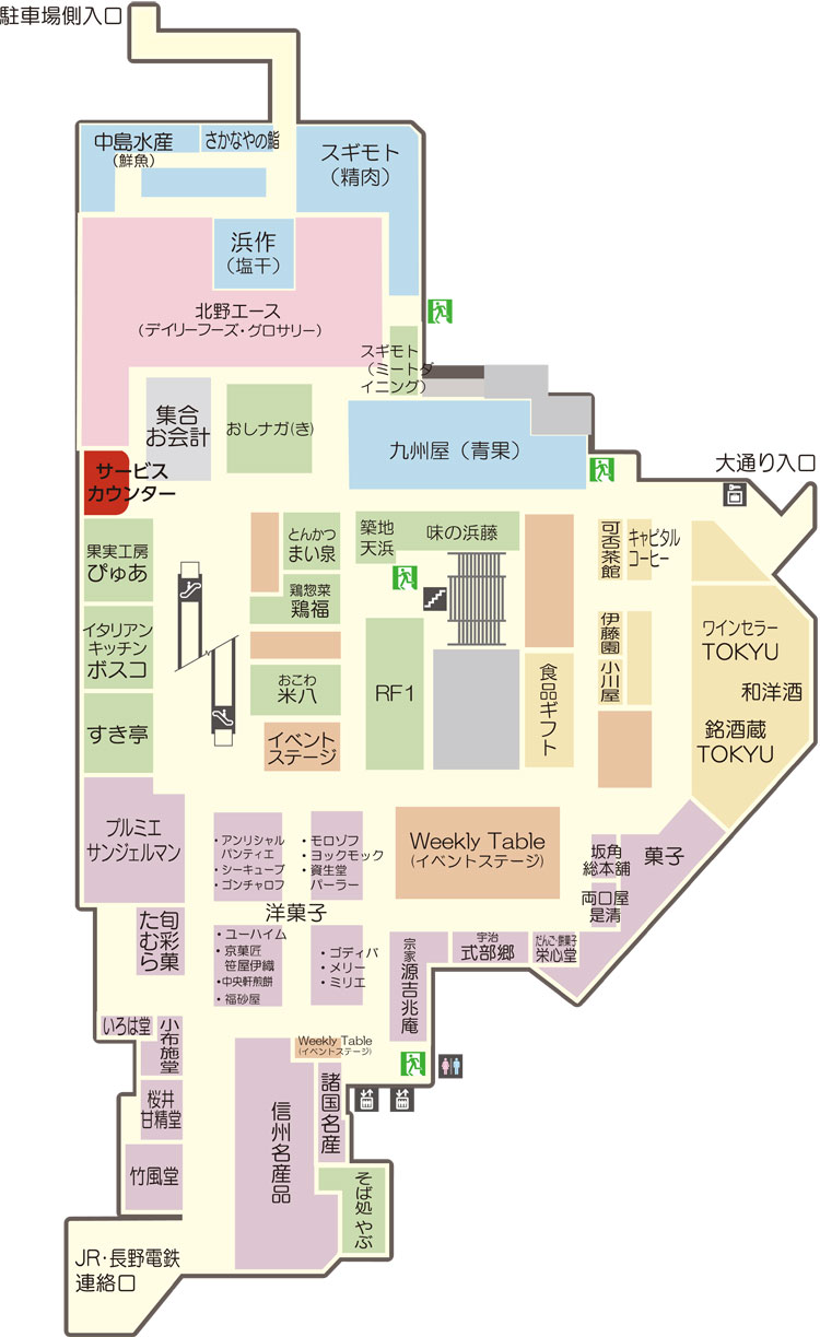 10月に長野県初出店の名古屋の老舗精肉専門店「スギモト」がオープンし、グロサリー専門店「北野エース」、鮮魚店「築地 中島水産」、青果専門店「九州屋」、鮮魚干物のセレクトショップ「浜作」がリニューアルした本館地下1階フードショー。