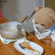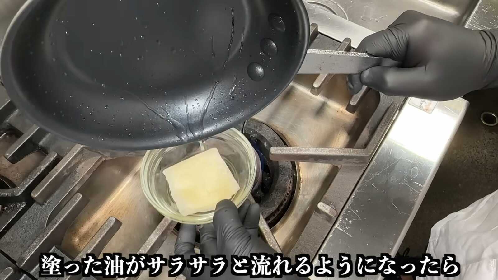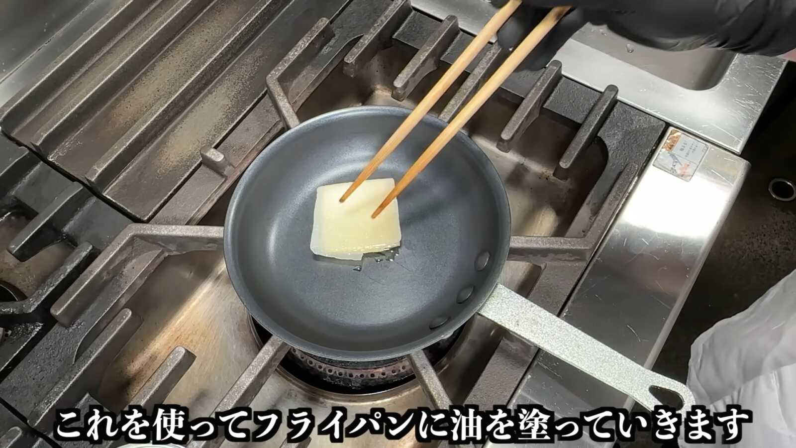 折りたたんだキッチンペーパーに油を浸し、フライパンに油をひきます。火をつける前に油をひいてください。