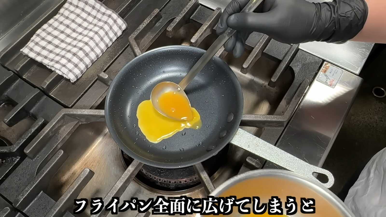 火加減を最も弱い弱火にして、卵液を縦長の長方形になるように流します。フライパン全面に入れると形を作るのが難しくなるため注意してください。