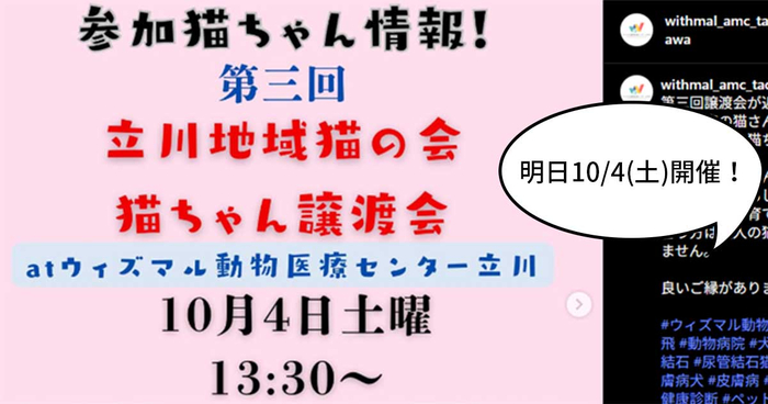 また、『ウィズマル動物医療センター 立川院』公式サイト( https://tachikawa-amc.com/info/161/ )によると10月18日(土)にも開催されるそう。