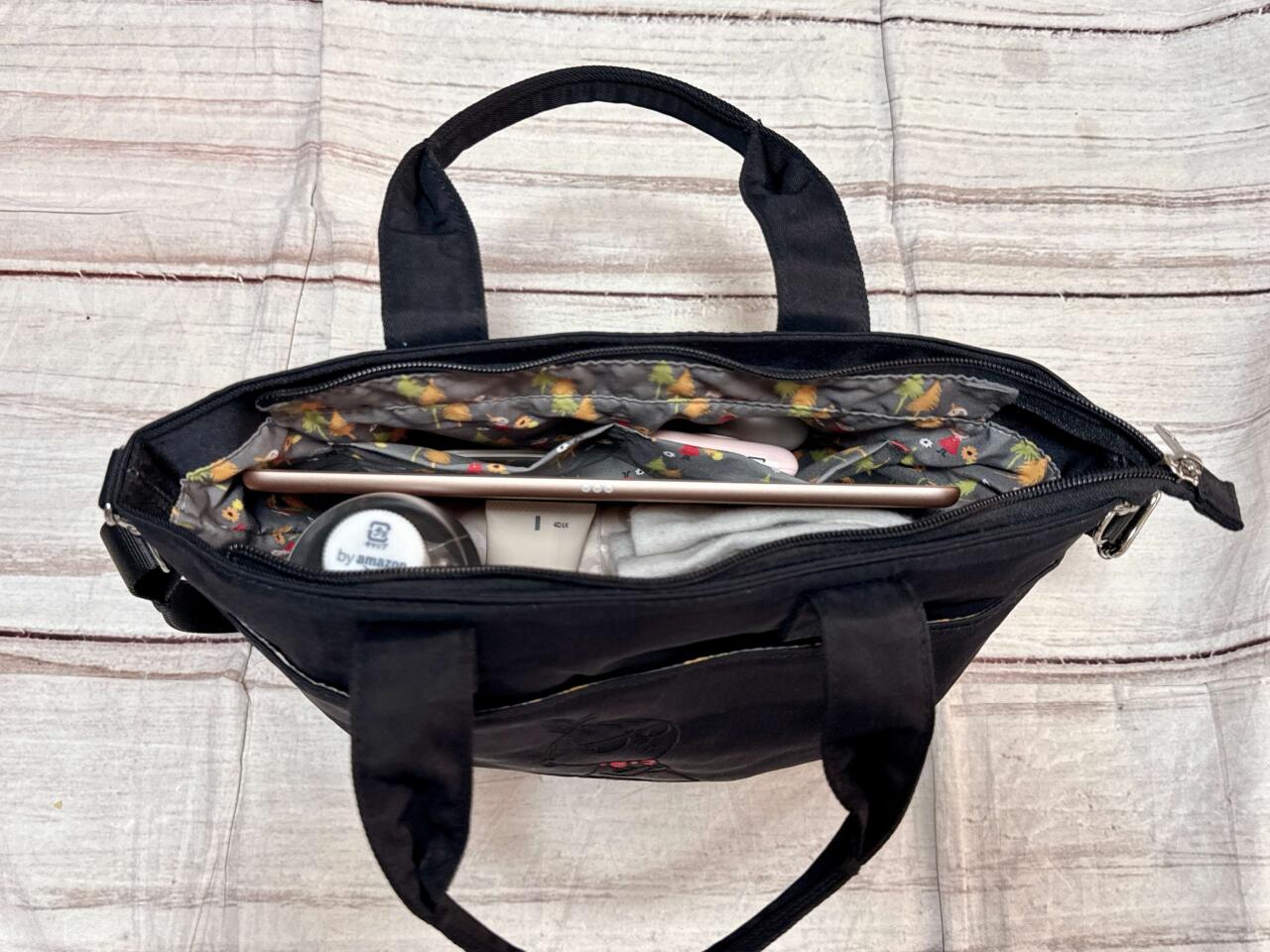 前面にリトルミイの大きな刺繍入りのデザインで、ベージュはリトルミイが目立つ印象。一方ブラックはよく見ると…といった感じでさりげない印象です。今回は、そのさりげなさに惹かれてブラックを購入しました。