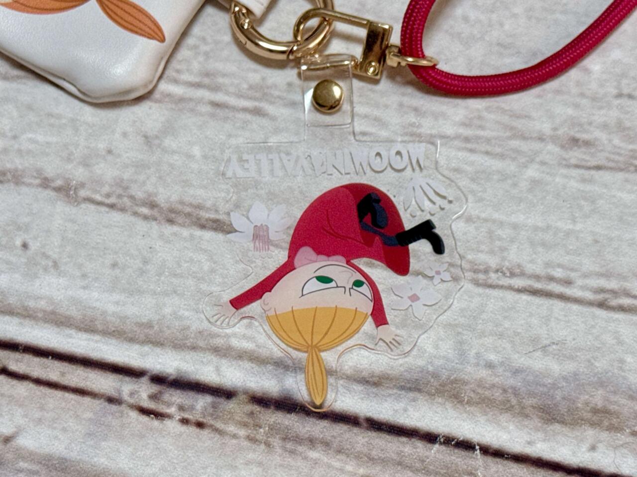 ポーチは高級感たっぷりな合成皮革素材。エクリュにレッドの洋服を着たリトルミイのイラストがプリントされたデザインです。背面にはピンクが基調のリトルミイのレザー調のタグ付きなのもかわいいポイント!