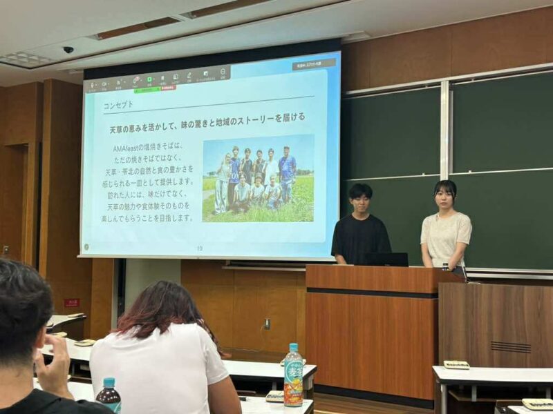 しかし,今年の2年生はそうした先輩たちとは異なるアプローチで出店に臨もうと商品企画をしました。行ったことも,見たこともない場所を訪問し,あらかじめ調べた商材を確認しに行く。それを使って試作を重ね,牛深地方で古くから食材として使われている雑節と苓北町で製造される塩を使った「塩焼きそば」を開発しました。
