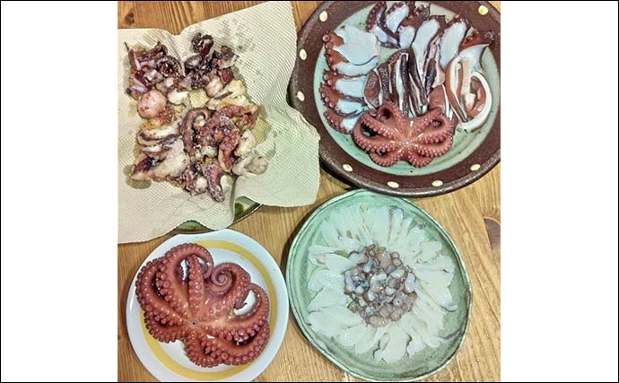 船中釣果は3~13尾。竿頭は右舷ミヨシで、香織さんは8尾、私が9尾。これから照りダコで、型もよくなり、食べて美味しく冷凍保存も効くので、狙ってみてはいかが。