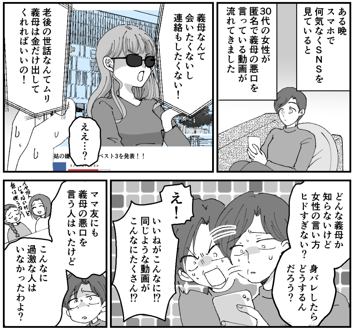もちろん私のママ友のなかには、義母との関係に悩んでいる人がいます。 ……でもママ友はグチを言う程度で、ここまでヒドい言い方はしていませんでした。 ママ友のグチと比べると、SNSで見る動画の内容はあまりにも過激です。
