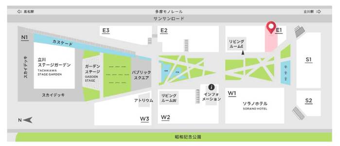 『RITUEL CAFÉ GREEN SPRINGS 立川店』と『土屋鞄製造所/grirose』(※休業中)の間です。