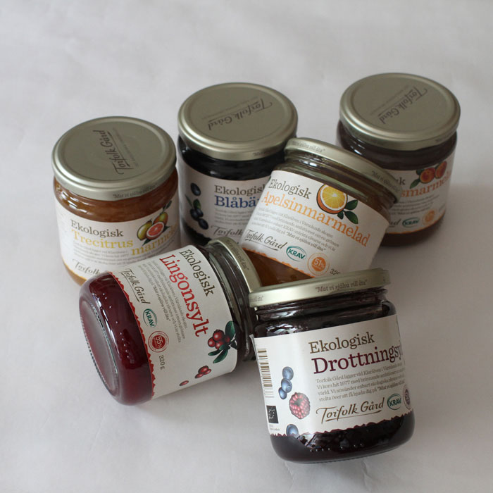 左:北欧の方々に愛され続けるスウェーデン〈Torfolk Gård (トルフォークゴード)〉のジャム。白夜が生み出す特別な濃く深い味わいは、通常のベリーよりも濃い実が育つ、最高の環境の中で作られています。
