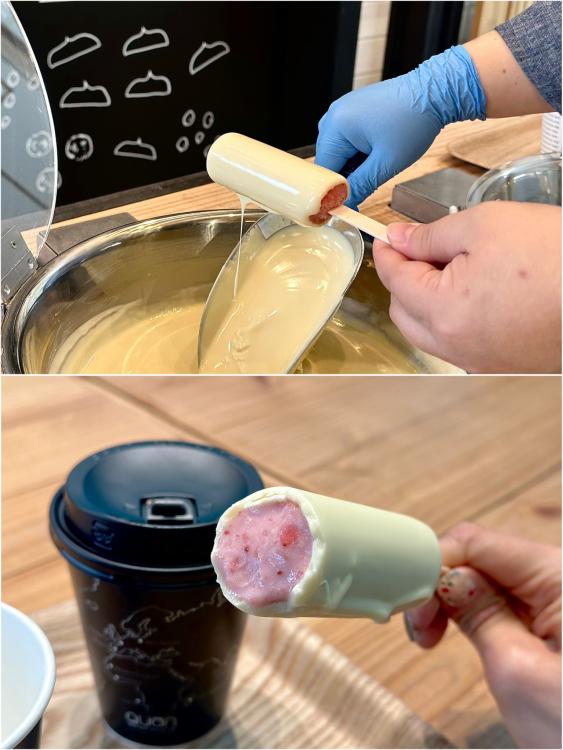 これはアイスキャンディに、特製ピュアチョコレートを自分でコーティングできるという、わくわくする体験つきのスイーツです。