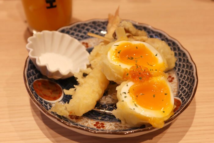 盛り合わせの他、1本ずつもオーダーできる「ドスエのおすすめ天クシ5本盛」今回は頂いたのは「宮城県産牡蠣」、「半熟卵いくら乗せ」、「海老」という鉄板ラインナップにしてみました。