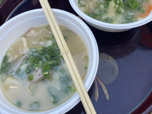 あったあった! 地元のおばちゃんたちが作ってくれるだご汁屋さんを発見! これは間違いないやつです。
