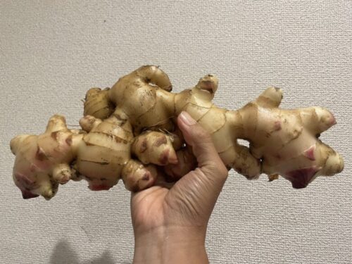 もはやダンベルのように見えるこの巨大な生姜だけでも、スーパーで買えば1,000円はしそうな大きさですが、これでも650g程度。 この3倍ほどの生姜が入っていて1,000円というのは、かなりお得!!!これを買えただけでも、しょうが祭に来た甲斐があったというものです。 生産者の皆様、立派な生姜をありがとうございます!