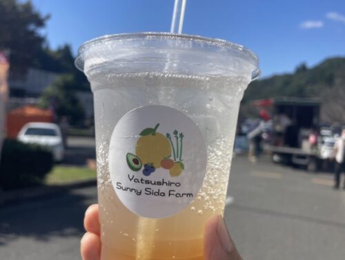 大きな丼椀に、たっぷりと盛られただご汁。 里芋や人参、大きなだごに、筍やごぼうも入っていて、栄養たっぷり! これはもう、文句なしで美味しい! 地元のおばちゃんたちが作る料理は、どの地域に行っても美味しいものです。 そんな意味のことわざがあってもおかしくないぐらいだと思います。 そして、せっかくのしょうが祭、もっと全力で生姜を味わいたい!…ということで、キッチンカーで出店されていた、やつしろサニーサイドファームさんの辛口ジンジャエールも。
