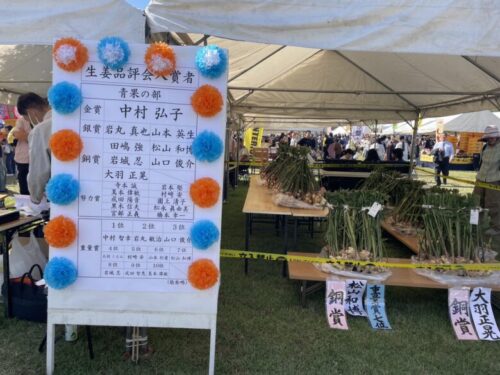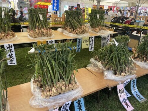 「しょうが祭」ということで、会場テントには、生姜品評会受賞者の立派な葉付き生姜も展示されていました。