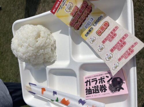 受付で支払いを済ませると、山盛りご飯に、引換券3種と投票券、そしてガラポン抽選券をもらえます。