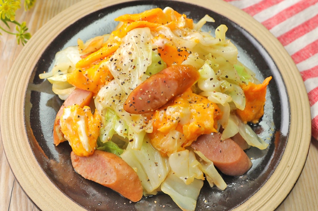 身近な材料でパパッと作れる「キャベツとウインナーと卵のバターしょうゆ炒め」のレシピをご紹介します。