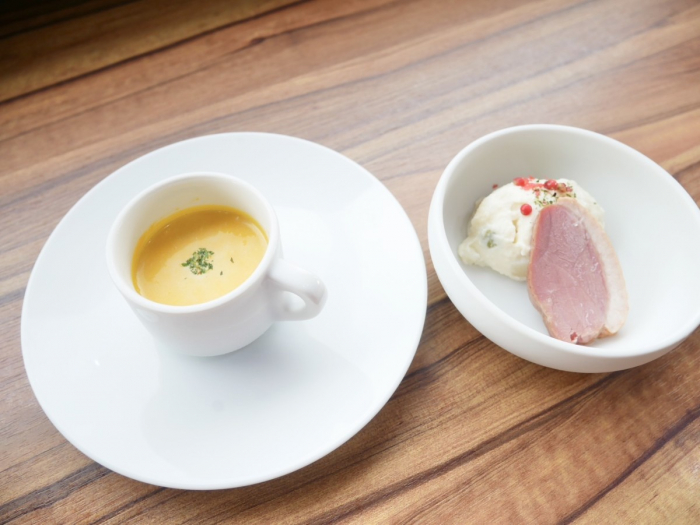 セットには、サラダとスープ付き。スープは季節により内容が変わり、この日は丸ごとオーブンで焼き上げて甘みを引き出したかぼちゃを使用し、淡路玉ねぎと合わせた優しい味わいでした。