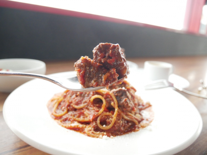 パスタのお肉は赤ワインに一日漬け込んだ牛頬肉を、じっくり時間をかけて煮込むことで、スプーンでほぐれるほど柔らかく仕上げられています。ゴロゴロと存在感があり、口に入れるとほろほろと崩れ、赤ワインのコクと肉の旨味が口いっぱいに広がります。