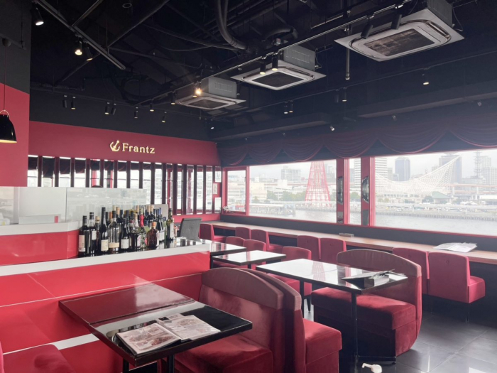 赤を基調とした店内は重厚感があり、ソファの座り心地も抜群。大きな窓ガラスからは神戸港を一望でき、港町ならではの贅沢な景色が楽しめます。まさに“神戸らしさ”を堪能できる空間です。