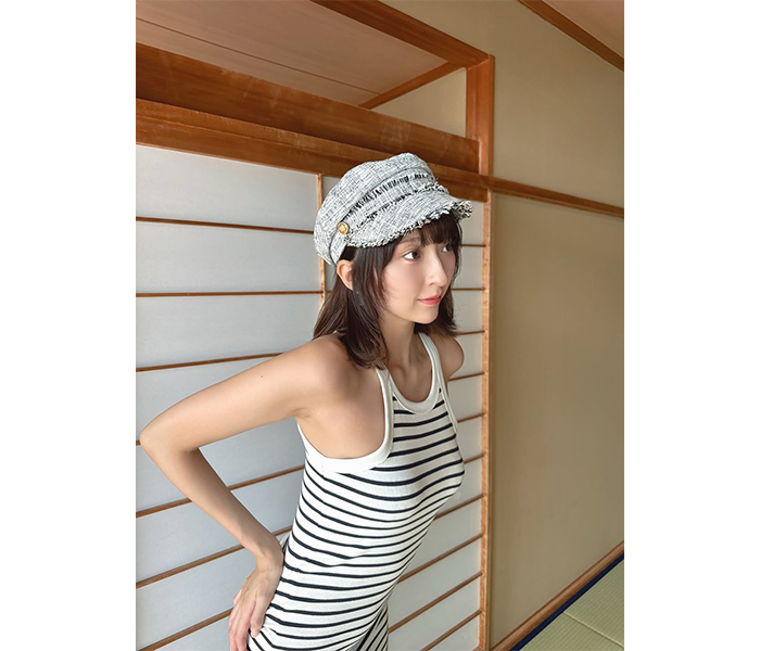 緒方咲はボーダー柄のタイトなワンピースを着用!