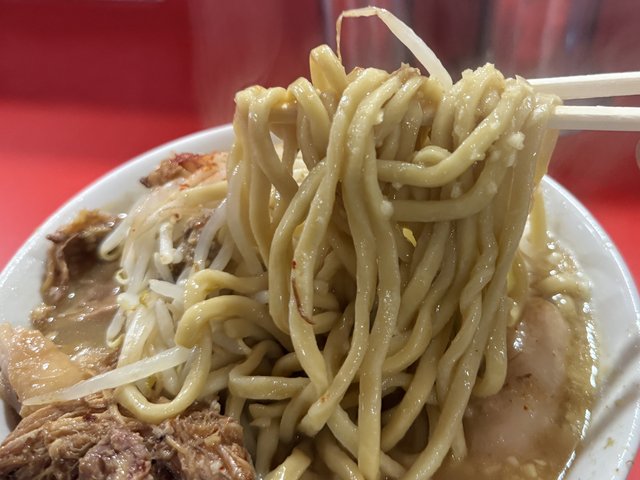 麺はムチムチとした自家製の極太ストレート麺。低加水でわしわしとした力強い食感がよく、小麦の香りも強め。スープとの絡みも抜群です。
