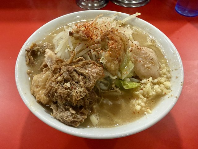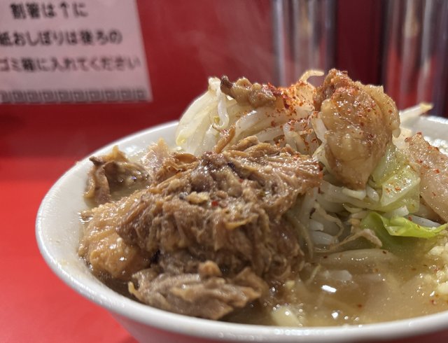 ほぐれるようなたっぷりのチャーシューに、大きめの背脂が特徴的。キャベツ、もやし、一味がトッピング。