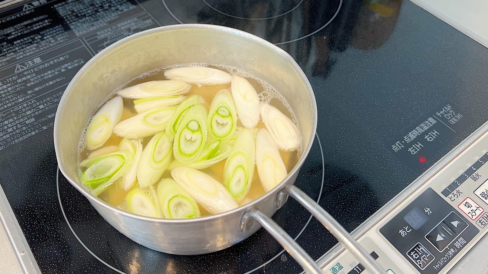 2 斜めに切った長ネギを入れ、沸騰したら火を弱めて煮る。