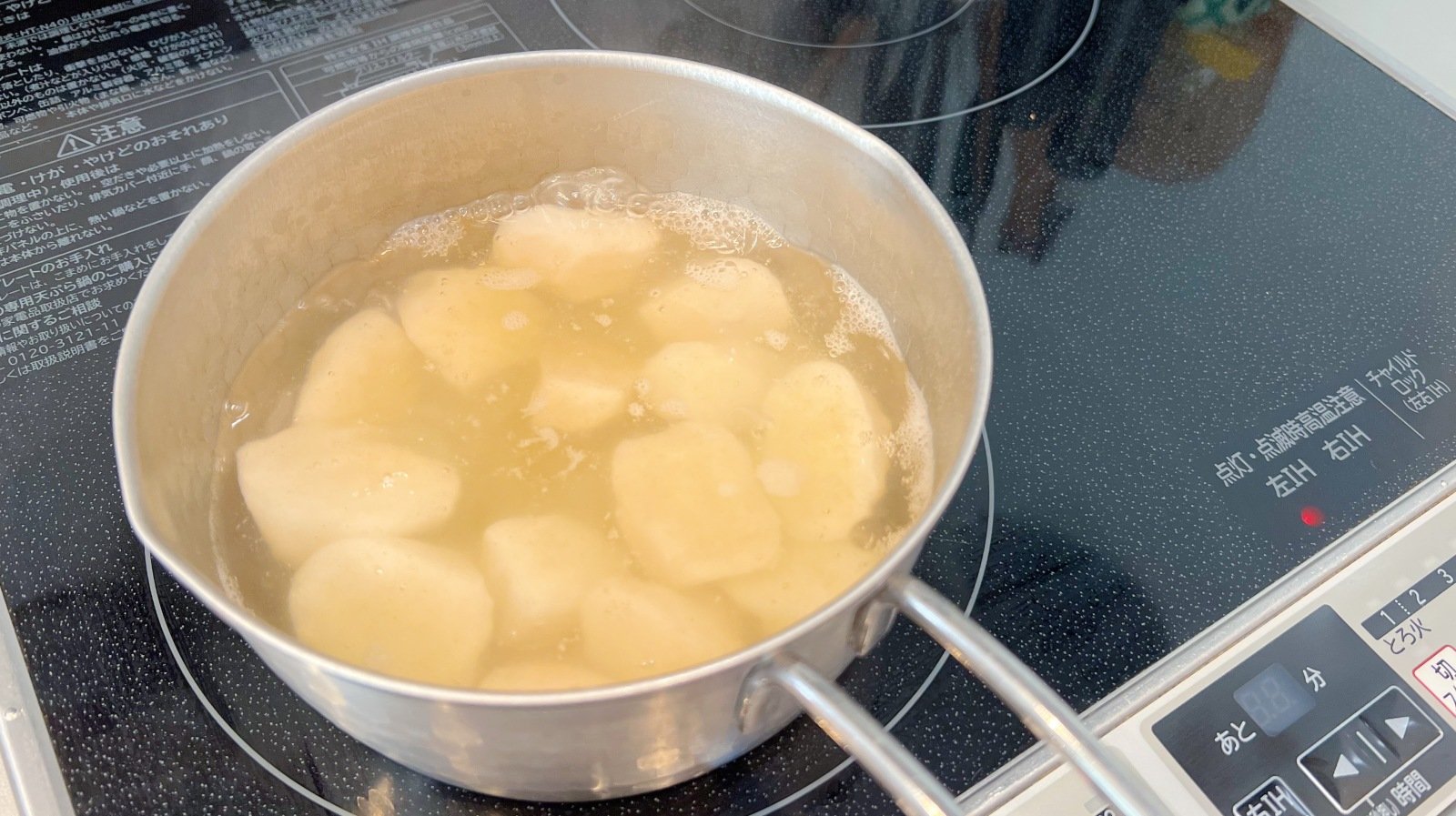 1 鍋にだし汁と食べやすく切った里芋を入れて中火にかける。