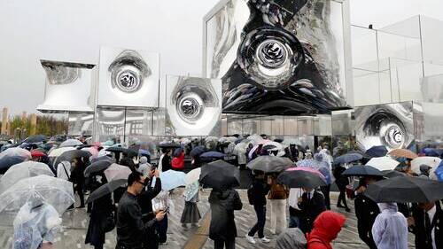 絵画教室で同コンテストの存在を知り、挑戦することになった。作品のモチーフとなったのは同パビリオン。写真を見て「きれいだと感じて、これをうまく描けたらすごいだろうな」と着想を得た。週1回絵画教室に通い、5〜6時間費やして制作。作品に透明感を出すために明るい色で光を表現し、白色や青色で縁取るなど工夫を凝らした。ドット(点)を散りばめることで賑やかさも演出。描き進めていく中でイメージを膨らませ、「万博や、会場となった大阪ならではのものを取り入れよう」と考え、公式キャラクターや大阪の名物などを描いた。