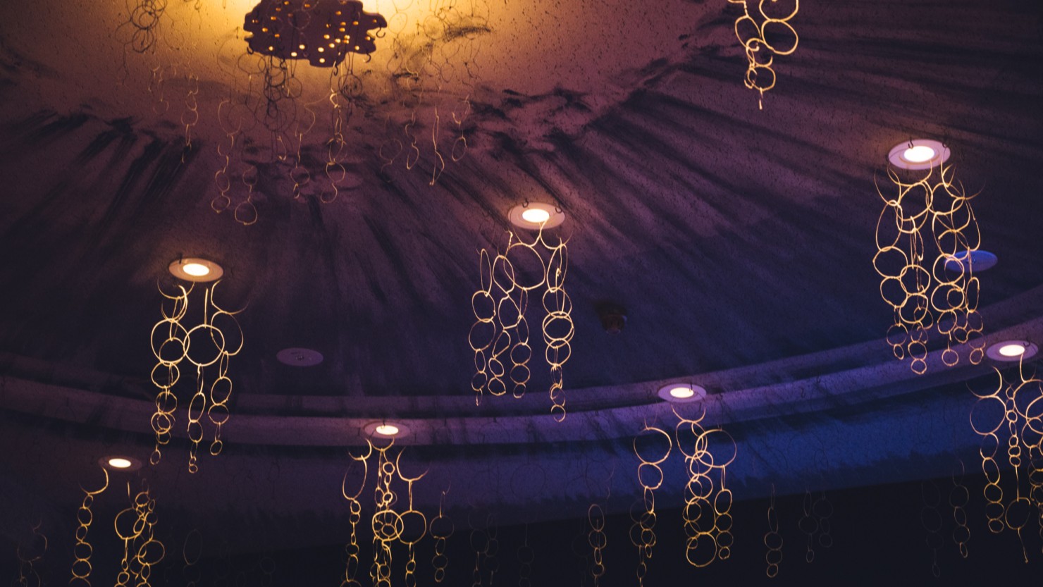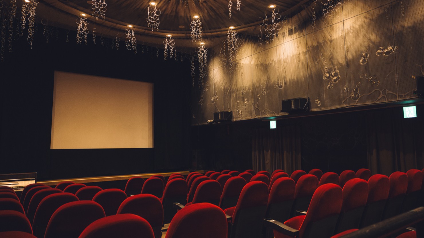 山﨑さん:映画を観るって、日常とは切り離された非日常の空間に入り込むことだという松本さんのイメージから、水中映画館をコンセプトに作られています。他の映画館だと、映画を邪魔しないシンプルな造りになっていることがほとんどですが、ヌーヴォ場内は、水泡に見立てた針金の装飾が天井から吊り下げられていたり、水面の絵が壁面に描かれていたり、場内が水中のようになっているんです。