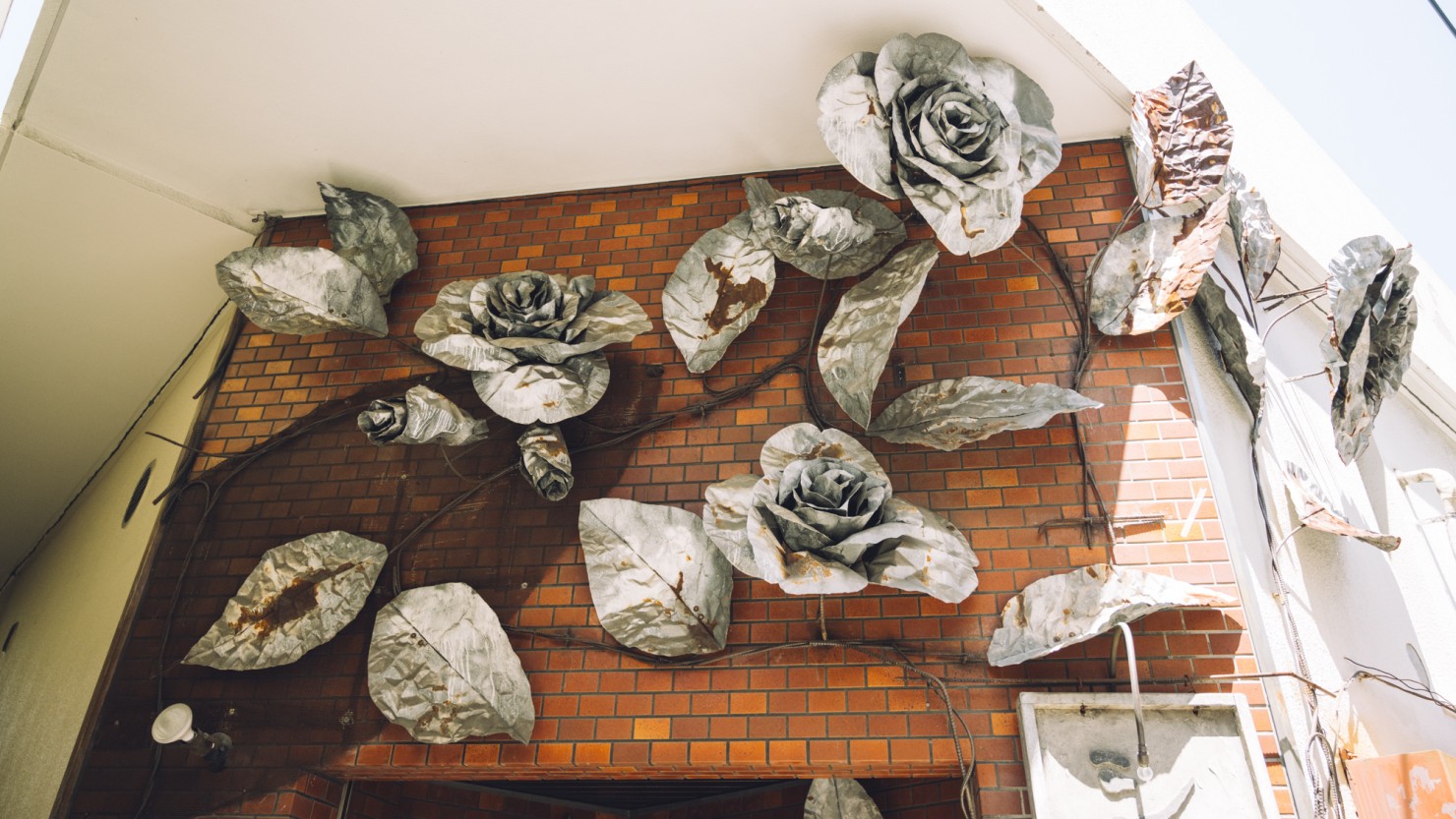 山﨑さん:外壁のバラのオブジェは、あえて錆びさせて無機質な素材感にしているのですが、シネ・ヌーヴォのアイコンになるようにという想いだけでなく「今からこの映画館でいろんな映画が流れて沢山の人が観に来てくれる。その活性化を通して、このバラを有機的なものに変えるのが今後のあなたたちの仕事ですよ」という松本さんからのメッセージが込められています。他にも、ロビーのカウンターやチラシを入れる棚も維新派が作ってくれたものなんですよ。
