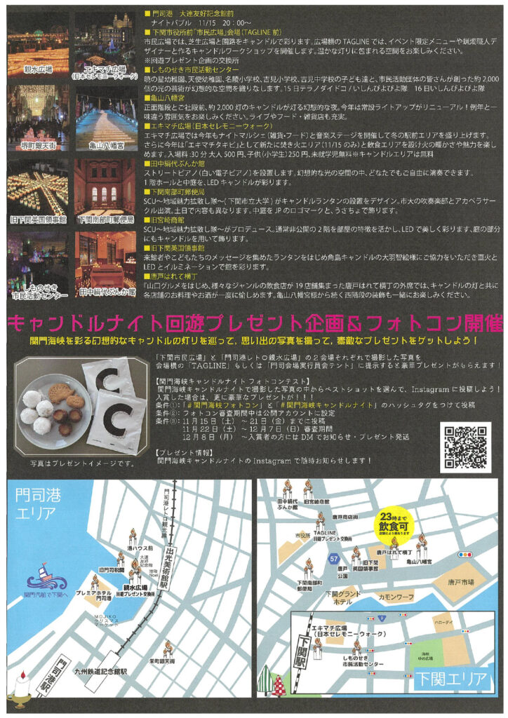 門司港レトロ展望室:キャンドルで彩られた港を上から眺める絶景スポット 唐戸市場夜市(周辺):イベント期間中も人気グルメが並ぶにぎやかなエリア 栄町銀天街(15日のみ):商店街があたたかい光で包まれる、まちぐるみの演出