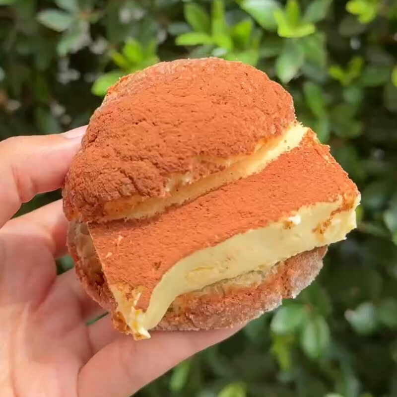 食べやすいサイズのメロンパンに、トロトロのティラミスがサンドされています。