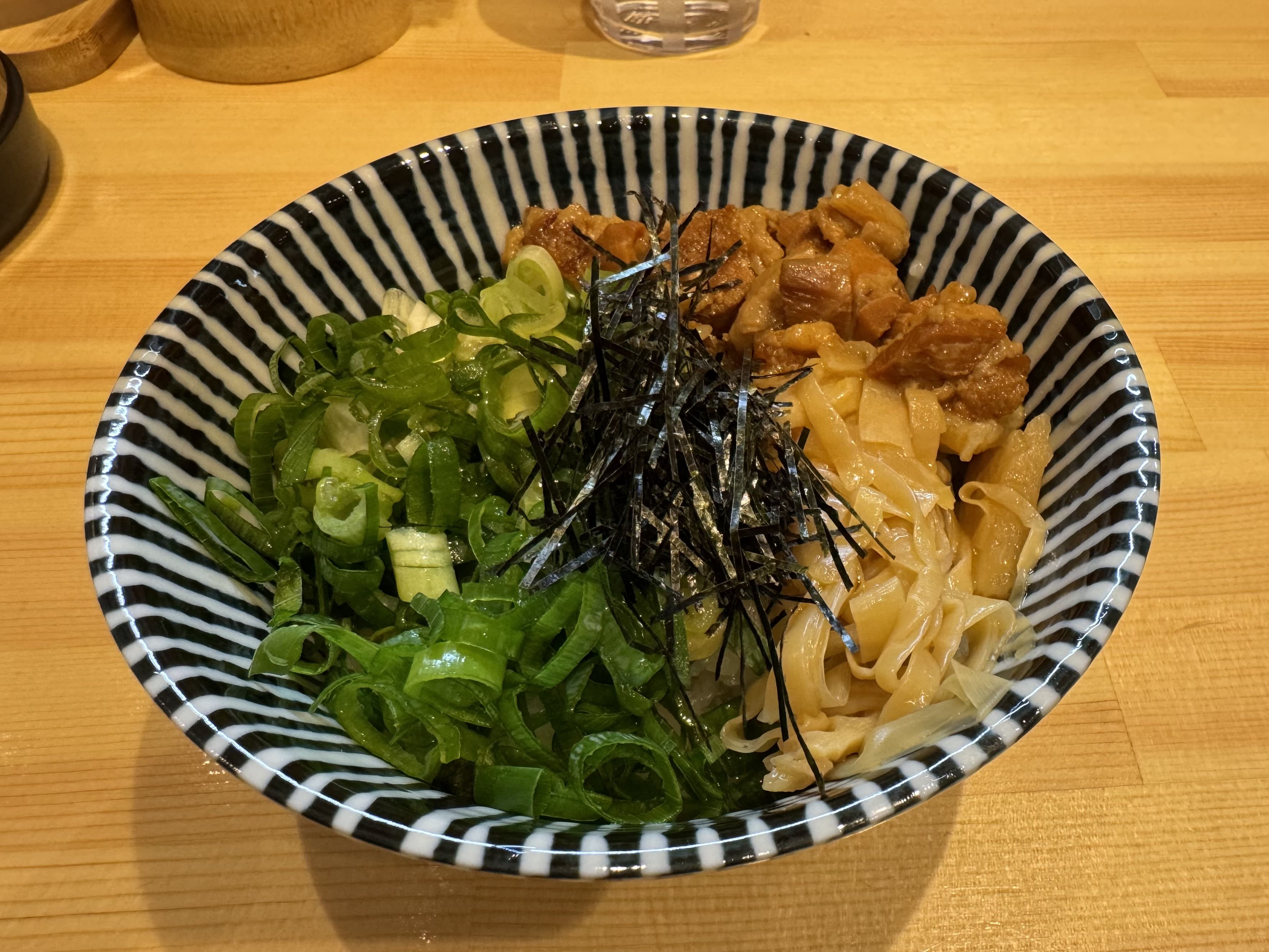 爽やかさはじける青ネギ、味付けしっかりのコリコリ食感穂先メンマ、そしてしっかり煮込まれた刻みチャーシューが丼いっぱいに敷き詰められています。お茶碗1杯分の量ですが、これは丼で食べたいくらい病みつきのおいしさ。