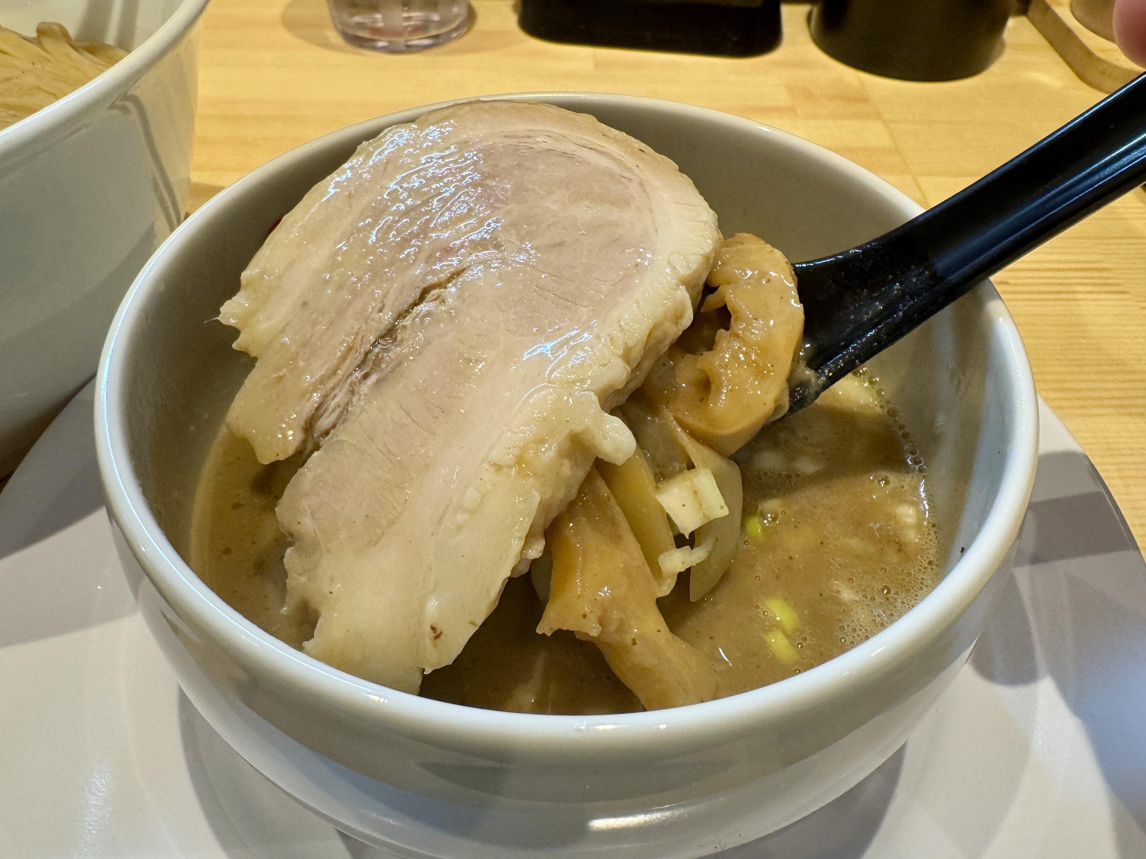 つけ汁の中には大判の豚バラチャーシューと穂先メンマがぎっしり。
