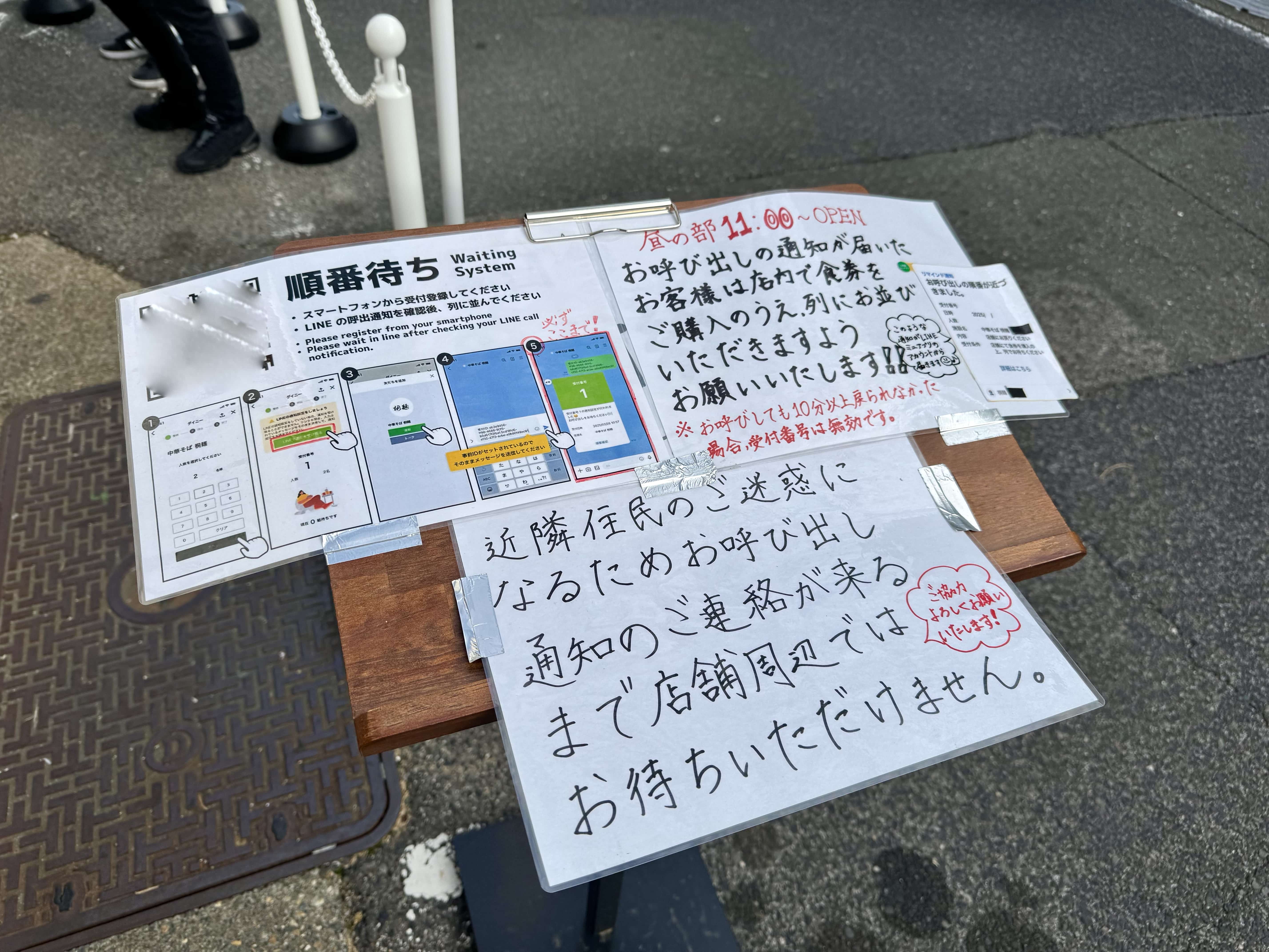 さぞ並ぶんだろうなと思いきや、LINEで順番通知が来る食券制度を導入。並び続ける必要がないのがとても嬉しい。お客さんと近隣住民への配慮が伺えます。(悪用防止のため、本記事ではQRコードは伏せています)