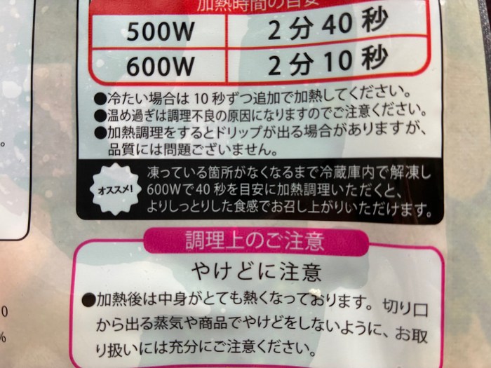なんなら「加熱調理をするとドリップが出る場合がある」とも書かれている。筆者がちゃんと読んでなかっただけである。無念~~~!!!