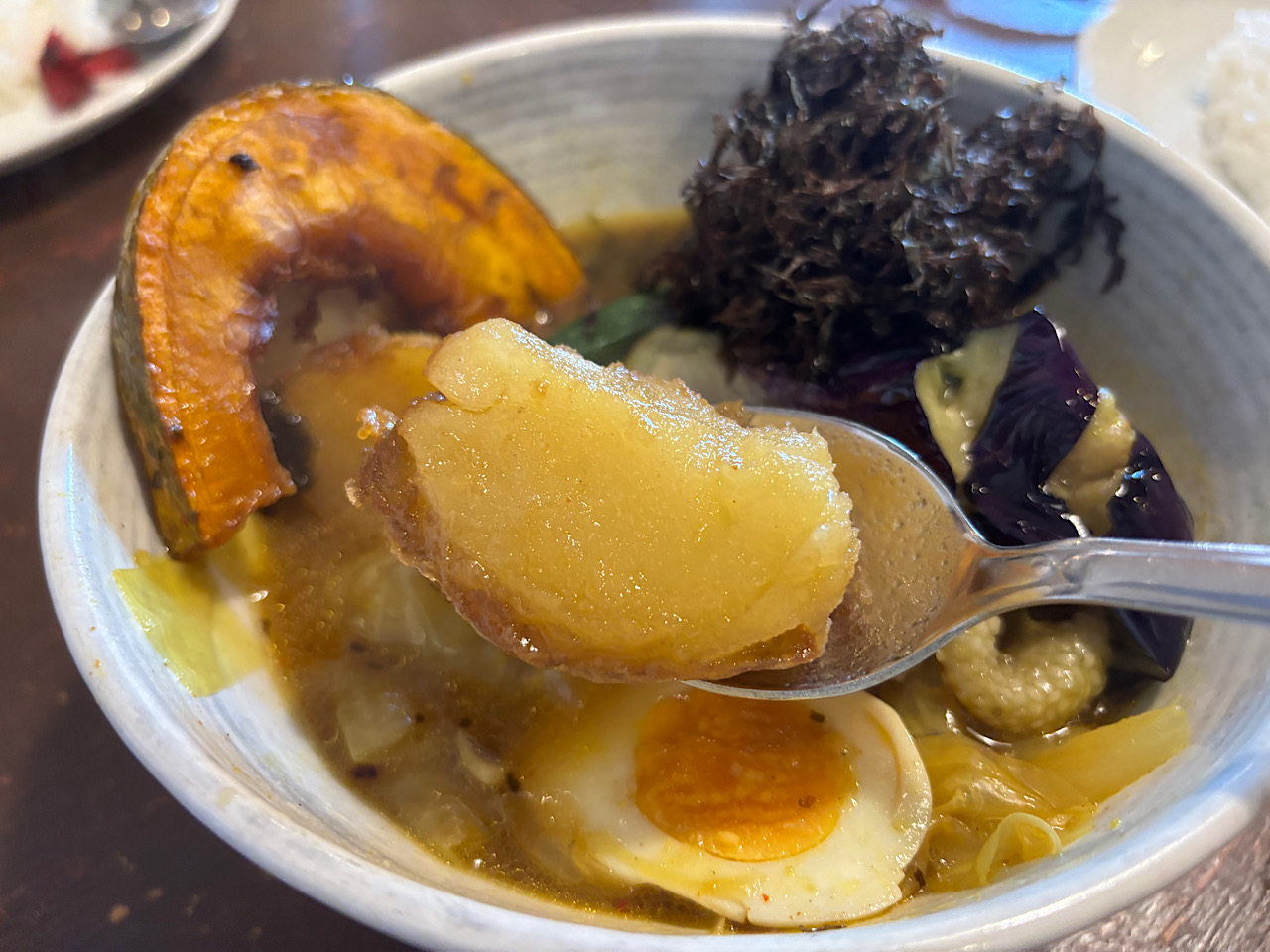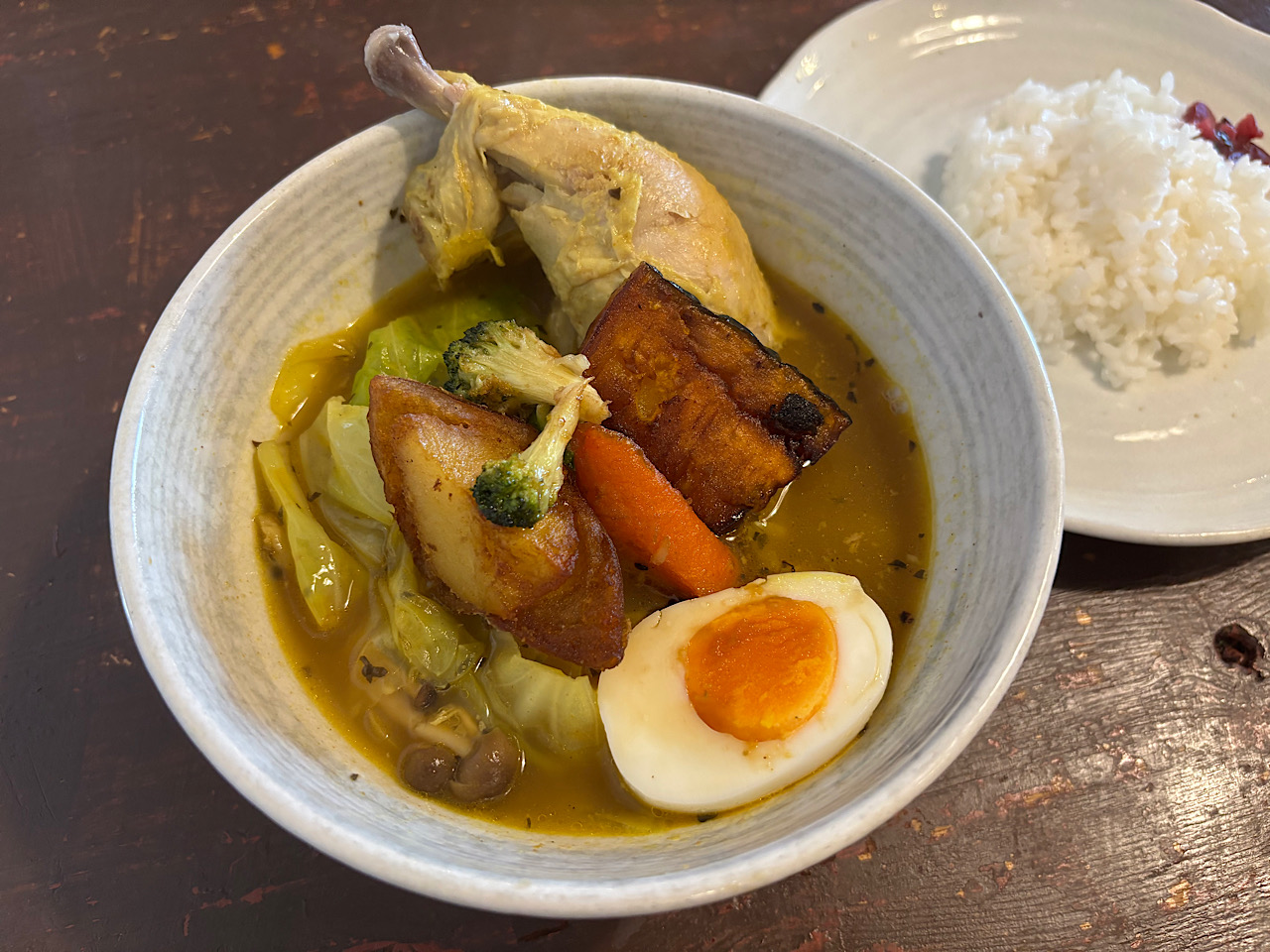 しっかりとスパイスが効いたスープ状のカレーに素揚げした野菜を煮込まずに加え、大ぶりのチキンや角煮などが添えられているのが特徴で、いまや一時的なトレンドやご当地グルメの域を超えて、カレーのいちジャンルとして定着した感があります。