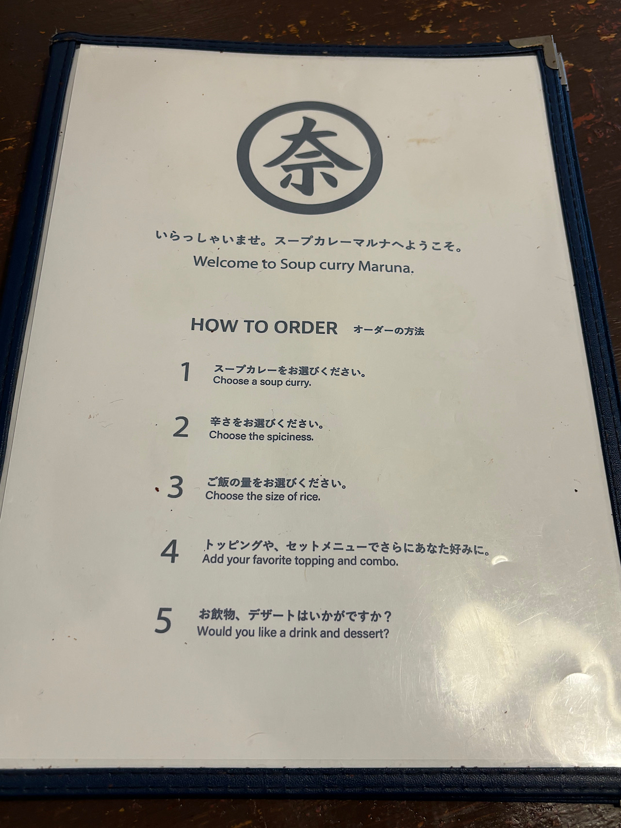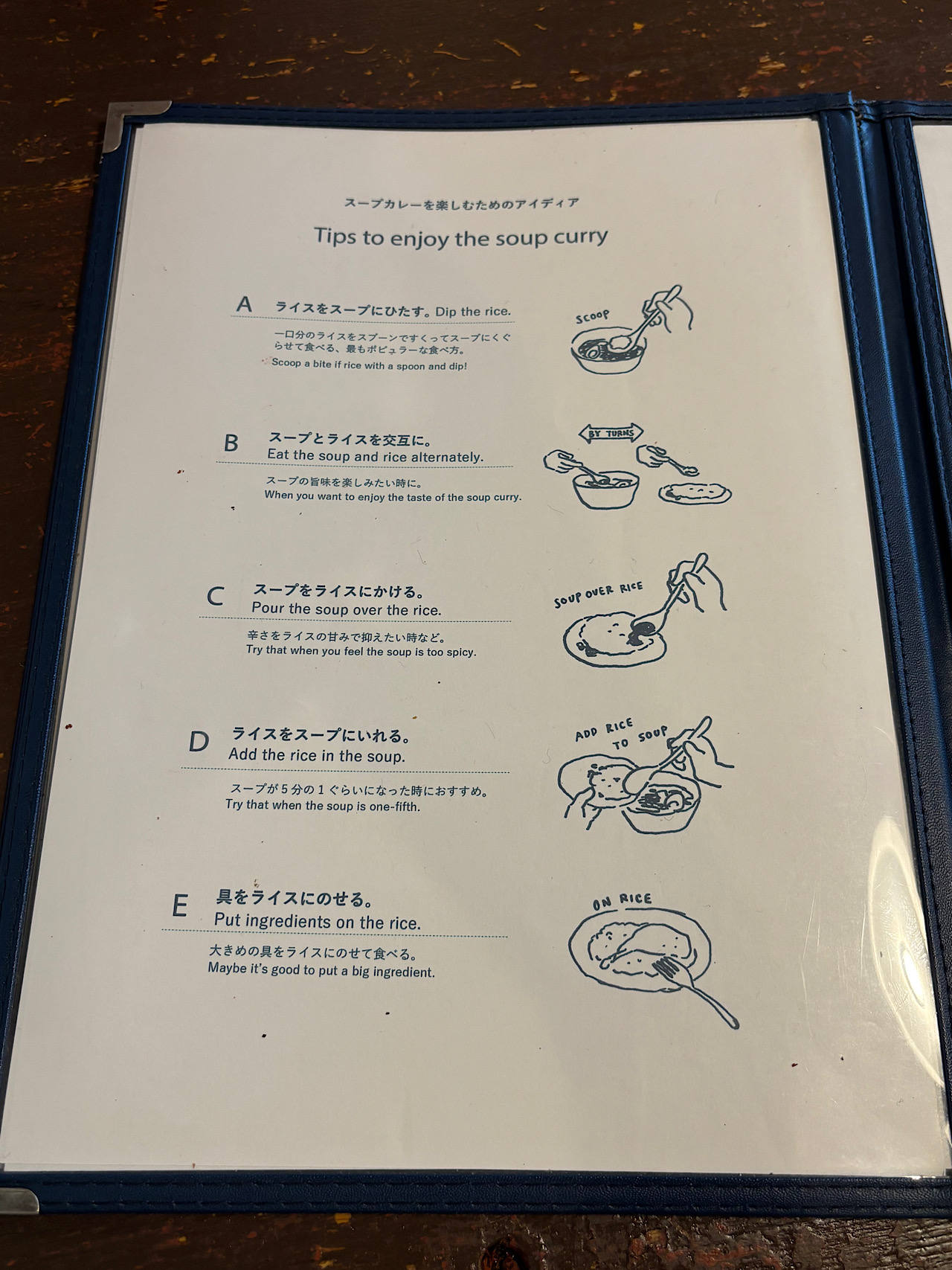 各テーブルに置かれたメニューには、スープカレーを食べるのは初めてという人も戸惑うことがないよう、わかりやすい注文方法や食べ方が書かれています。
