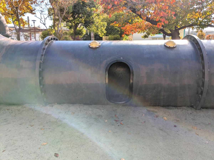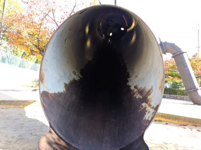 ベイコム陸上競技場の南側にある公園の敷地内に巨大なモニュメントのようなものを発見。こちらは尼崎市政70周年記念事業の1つとして美術家の榎忠さんが作られた「AMAMAMA」という鉄のすべり台です。
