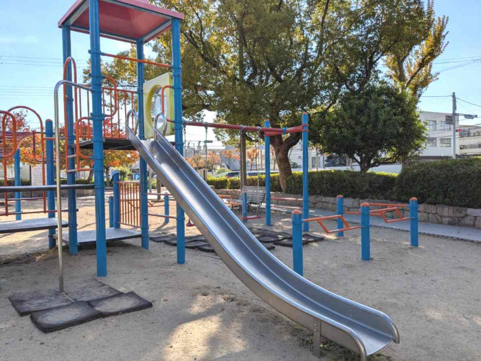 近くにはすべり台・ブランコ・うんていが一緒になった複合遊具もあり、こちらは小さなお子さんも安心して遊べます。