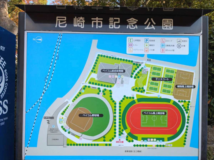 公園までは阪神尼崎駅から徒歩で約18分、阪神バスの「スポーツセンター」停留所下車すぐのところにあります。
