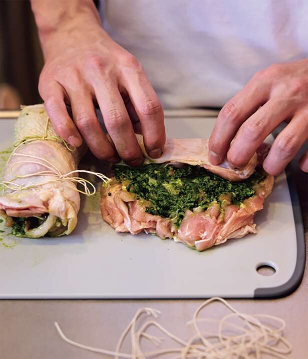 3 鶏肉を皮目が下になるように広げたら、1のペーストを塗って巻き、崩れないようにしっかりとたこ糸で縛る。塩、こしょうを軽く振る。