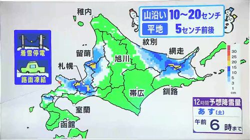 留萌周辺で朝まで雪が降り、風を伴うでしょう。道路標識などへの着雪にも注意して下さい。旭川など内陸でも濡れた路面の凍結に注意が必要です。