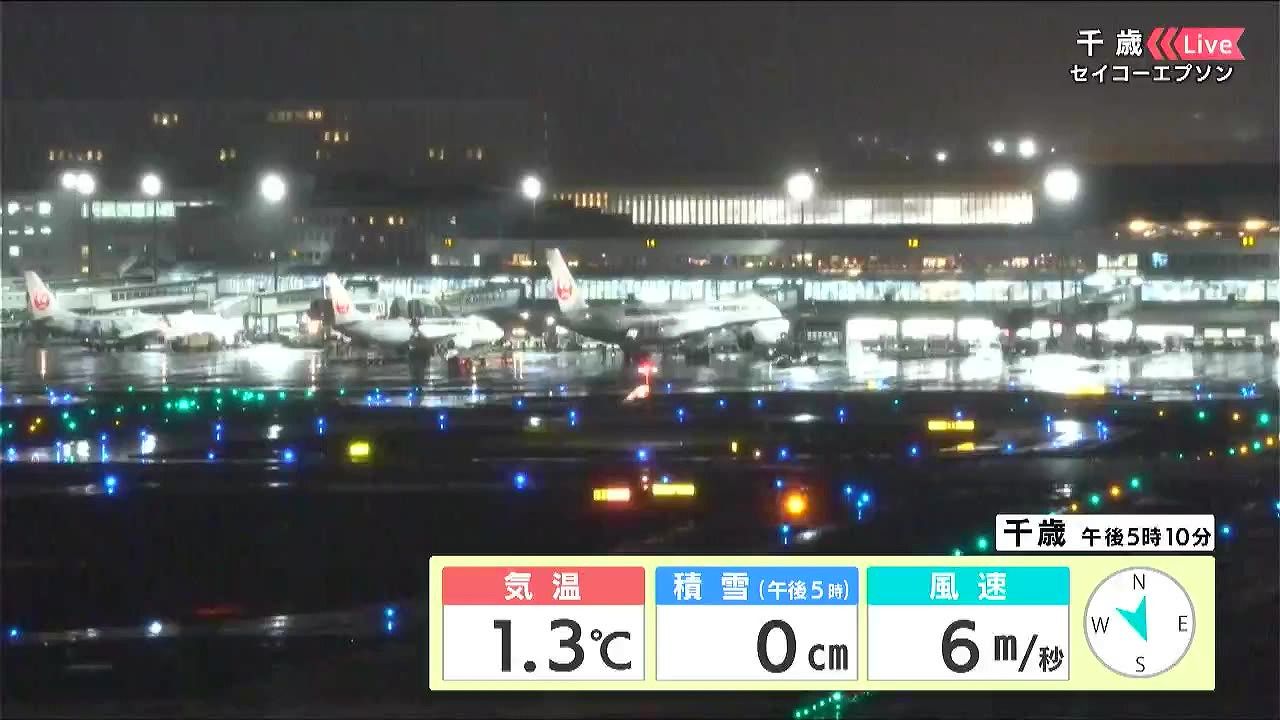 新千歳空港です。千歳でもあす8日(土)朝はうっすら積もりそうです。念のため交通情報もご確認ください。