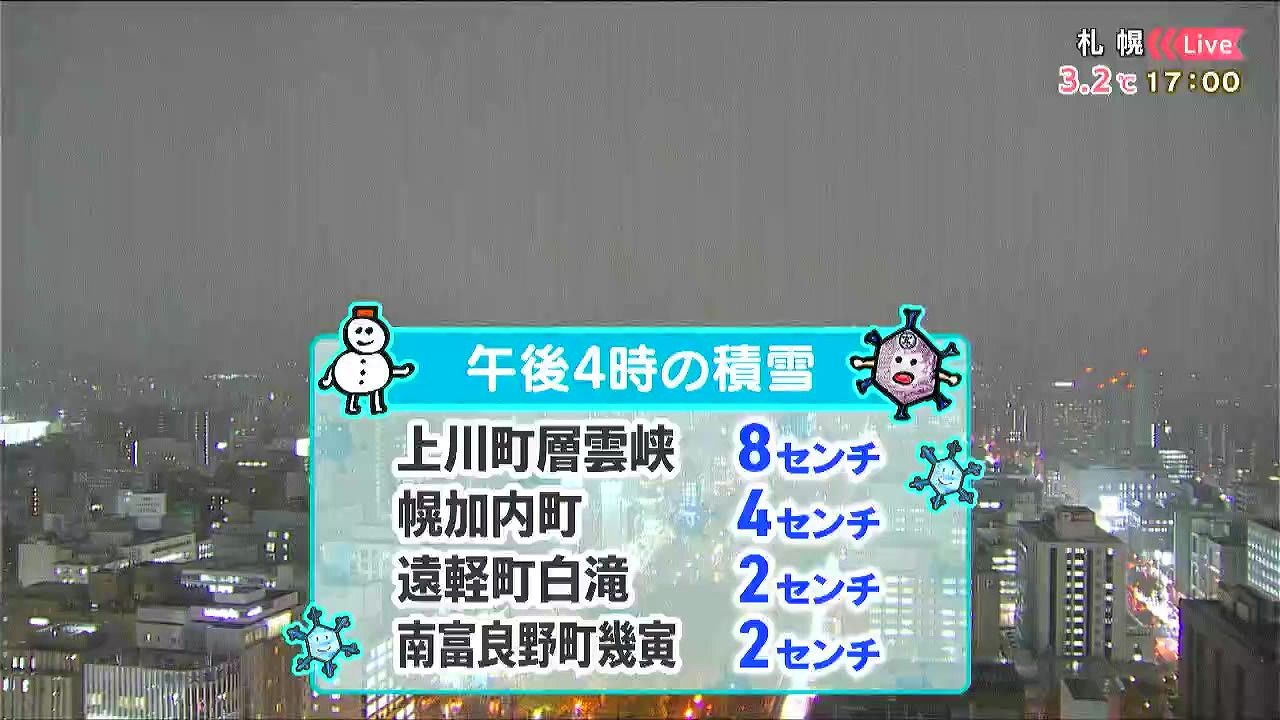 午後4時の積雪は、上川町の層雲峡で8センチ、幌加内町で4センチ、紋別地方の遠軽町白滝と上川地方の南富良野町幾寅で2センチでした。
