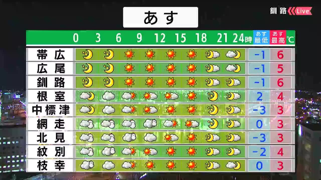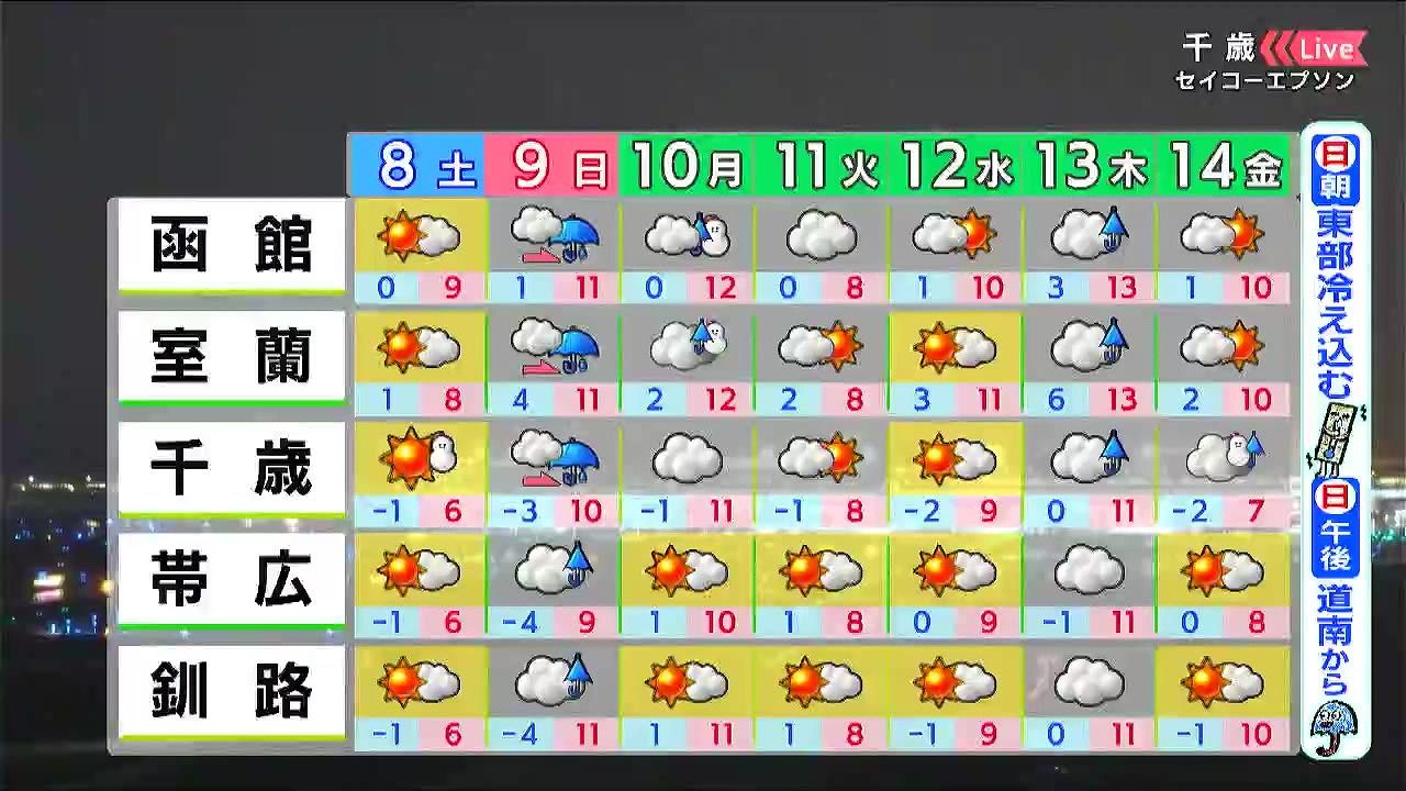 日曜の朝は穏やかですが、道東で今シーズン一番の寒さで、帯広と釧路は‐4度まで下がります。日曜の午後は道南から雨が降り、月曜は道南で雪がまじるでしょう。