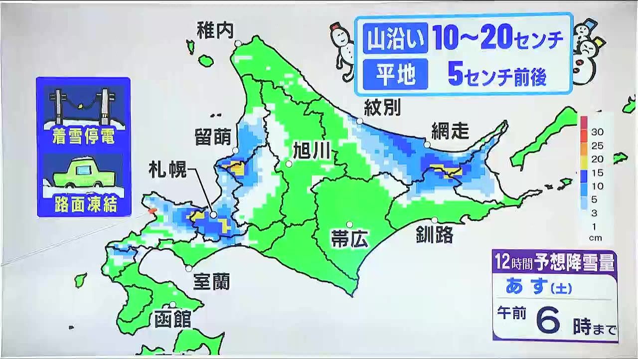 今夜からあす8日(土)朝にかけても雪が降ります。午後6時からあす8日(土)午前6時までの12時間に降る雪の量です。オホーツク海側や留萌から石狩湾にかけてが雪の中心です。峠など山沿いの多いところで20センチ、平地でも広く5センチ前後降って、積もるでしょう。湿った雪で、風も強いため、着雪による停電や、路面状況の変化に注意して下さい。そして、札幌でもあす8日(土)朝は雪かきが必要になりそうです。