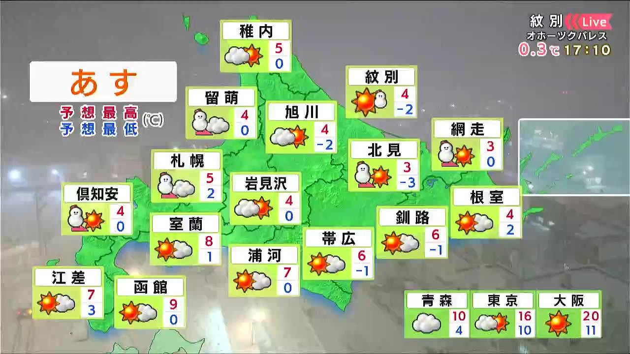 道東は晴れますが、寒いでしょう。網走や知床半島では昼頃まで雪が降り、風が強く、海は大しけです。北見や紋別も朝まで雪で積もるおそれがあります。
